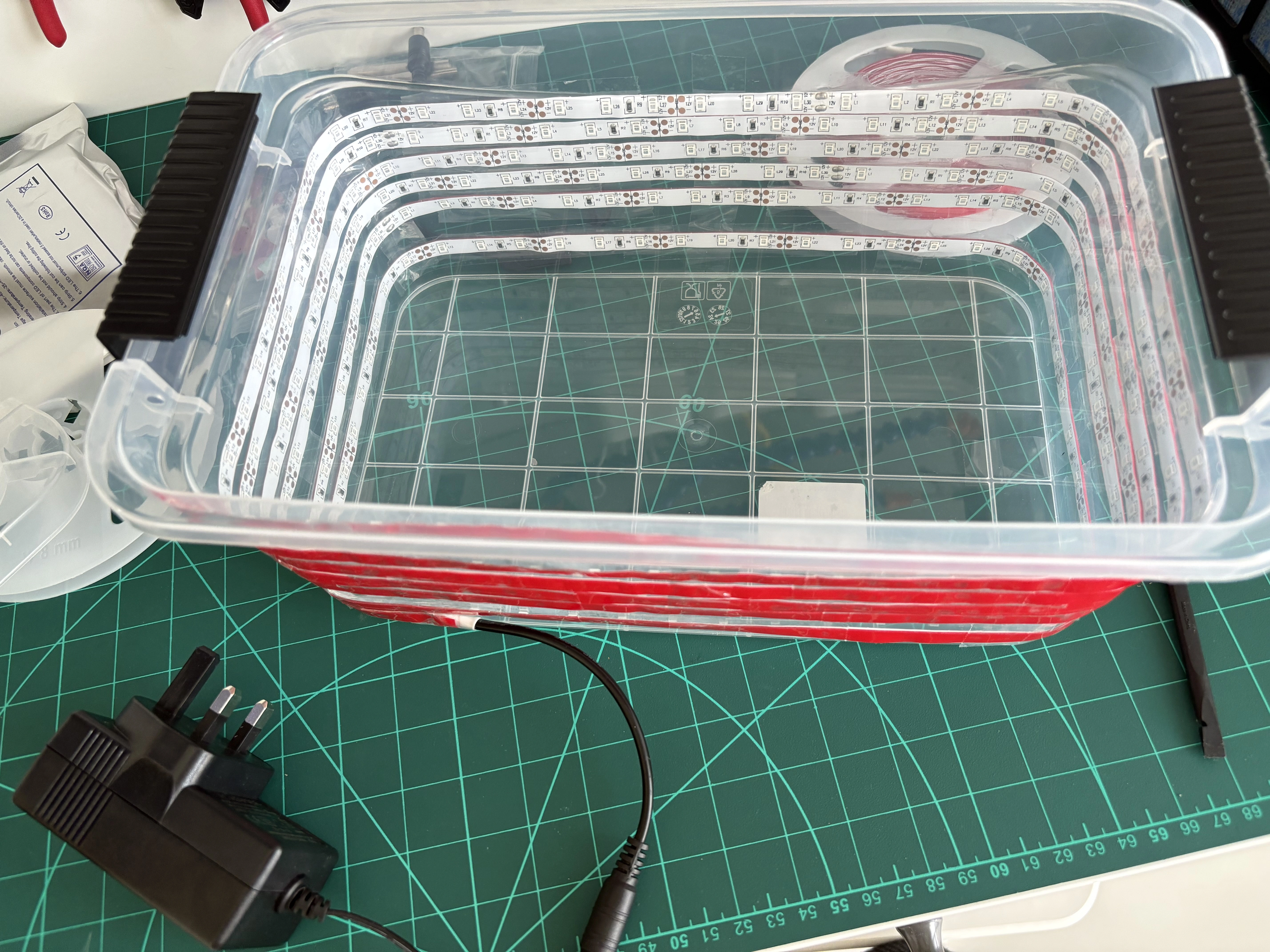 I chose something just big enough to fit the controller shells so I wouldn’t need to use more hydrogen peroxide than necessary. The box is clear because we need the UV light to pass through its walls. The UV light will come from the LED strip wrapped around the container walls.