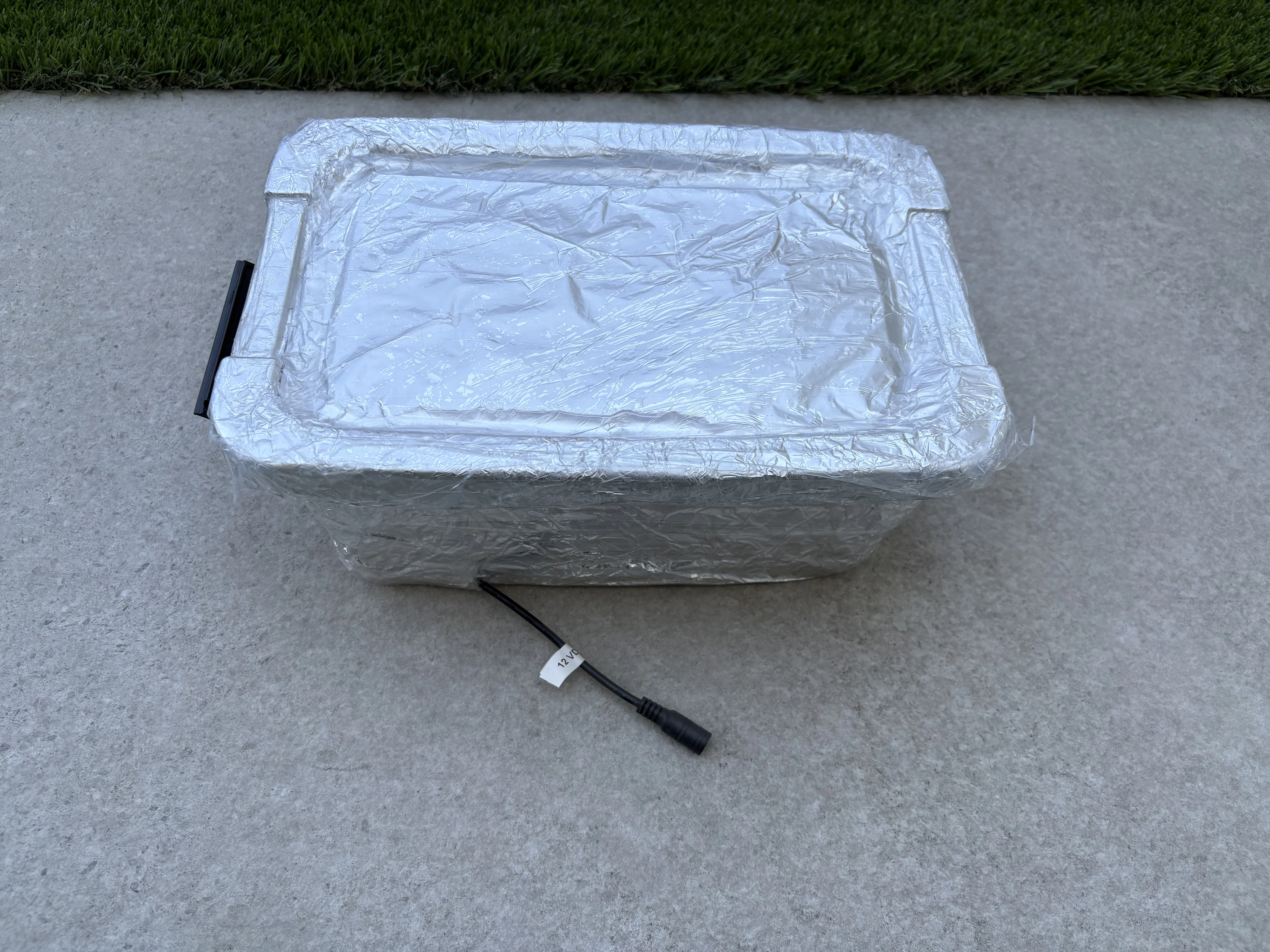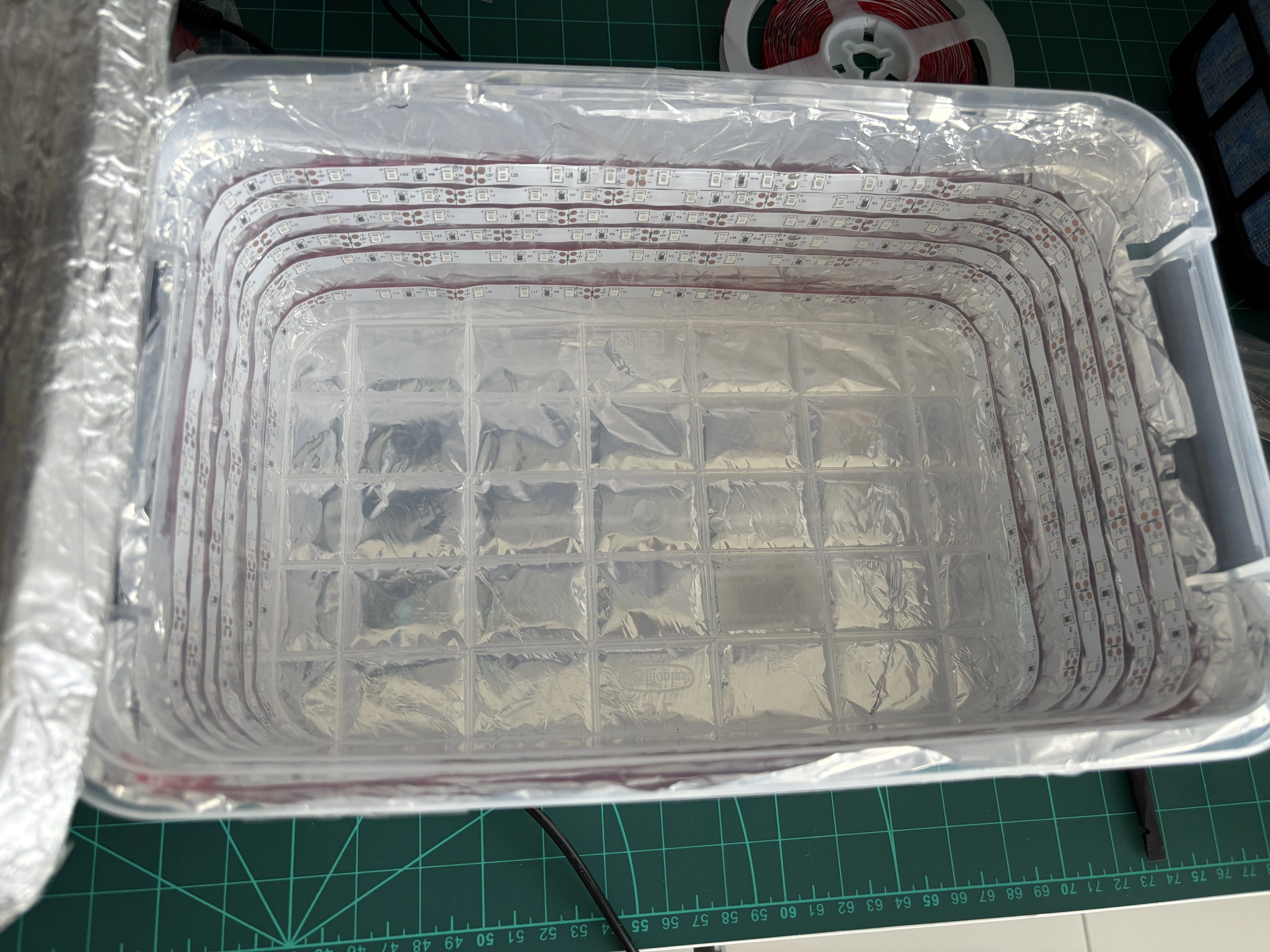 First, I wrapped the LED strip around the plastic container. Then I wrapped aluminum foil on top of the LED strip, as well as over the container lid. I finished the wrapping with a layer of clear tape so the foil is protected and won’t tear over time.