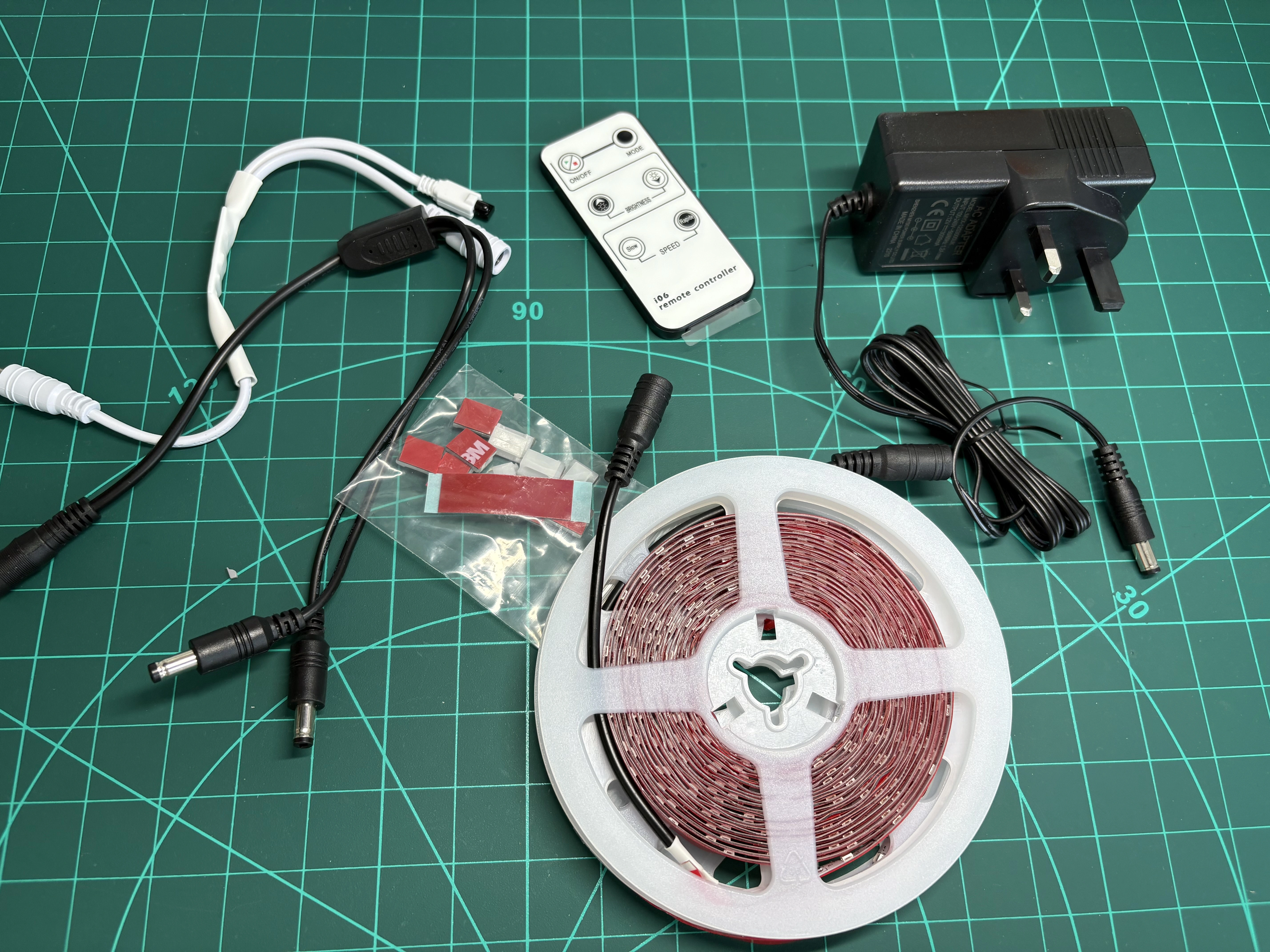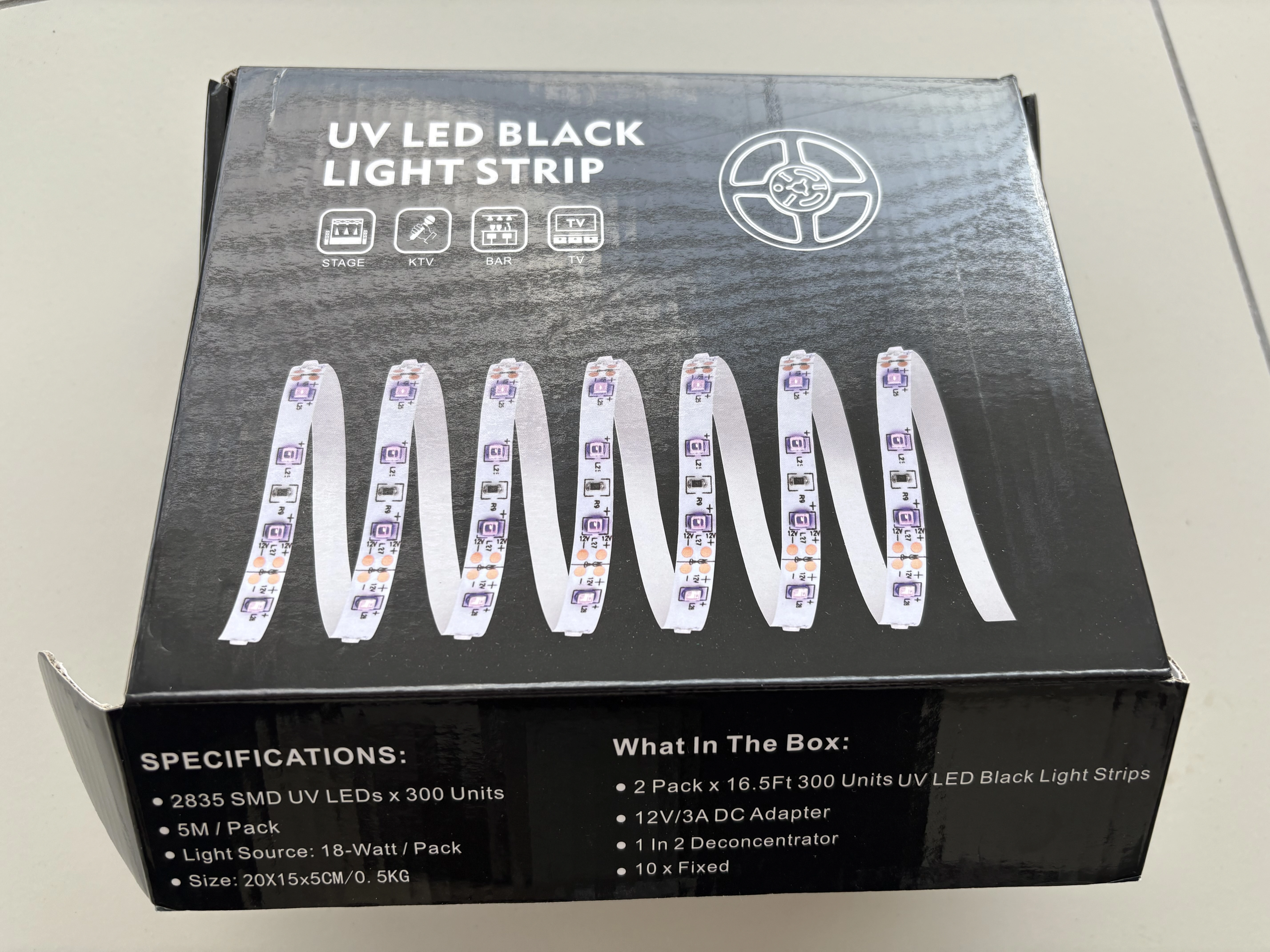 I got a 5-meter-long UV LED strip. It comes with a 12V DC adapter and includes DC jack connectors and adapters, so I didn’t need to cut or solder wires.