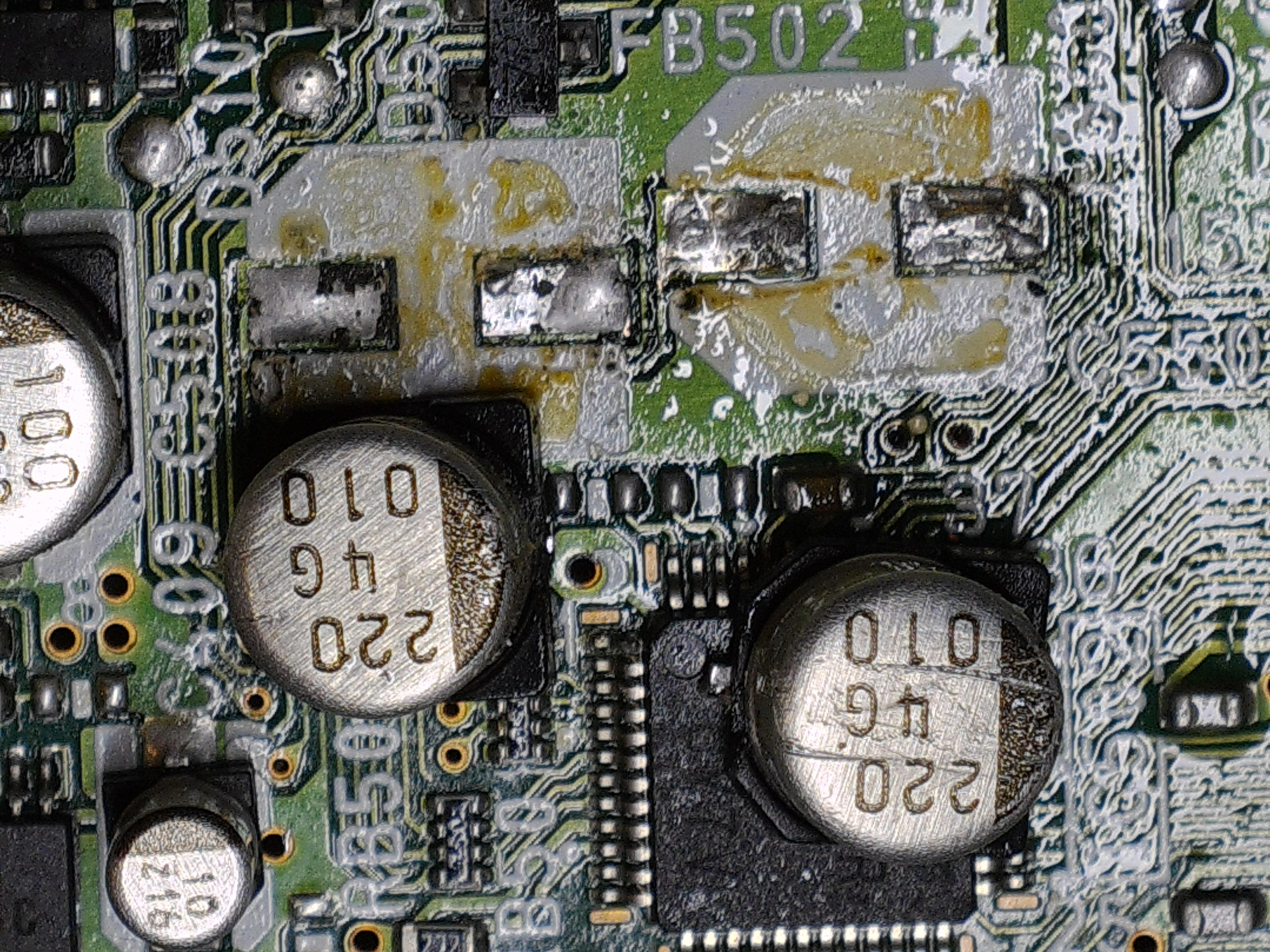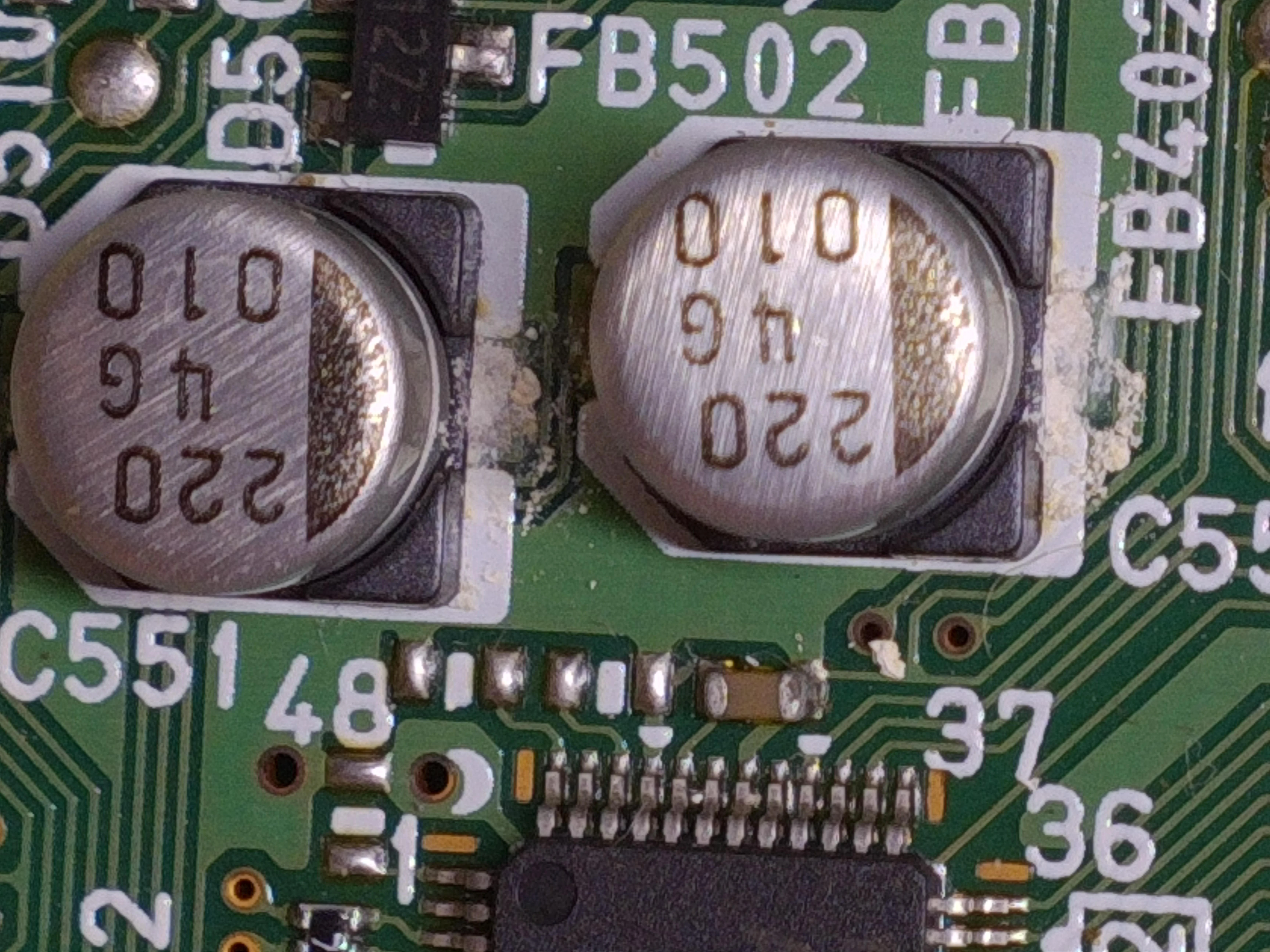 I was curious to measure the old capacitors. I soldered leads to their pads to plug them into my tester. They showed capacitance in pico- and nano-Farads - nowhere near the expected 220 µF. Definitely bad.
