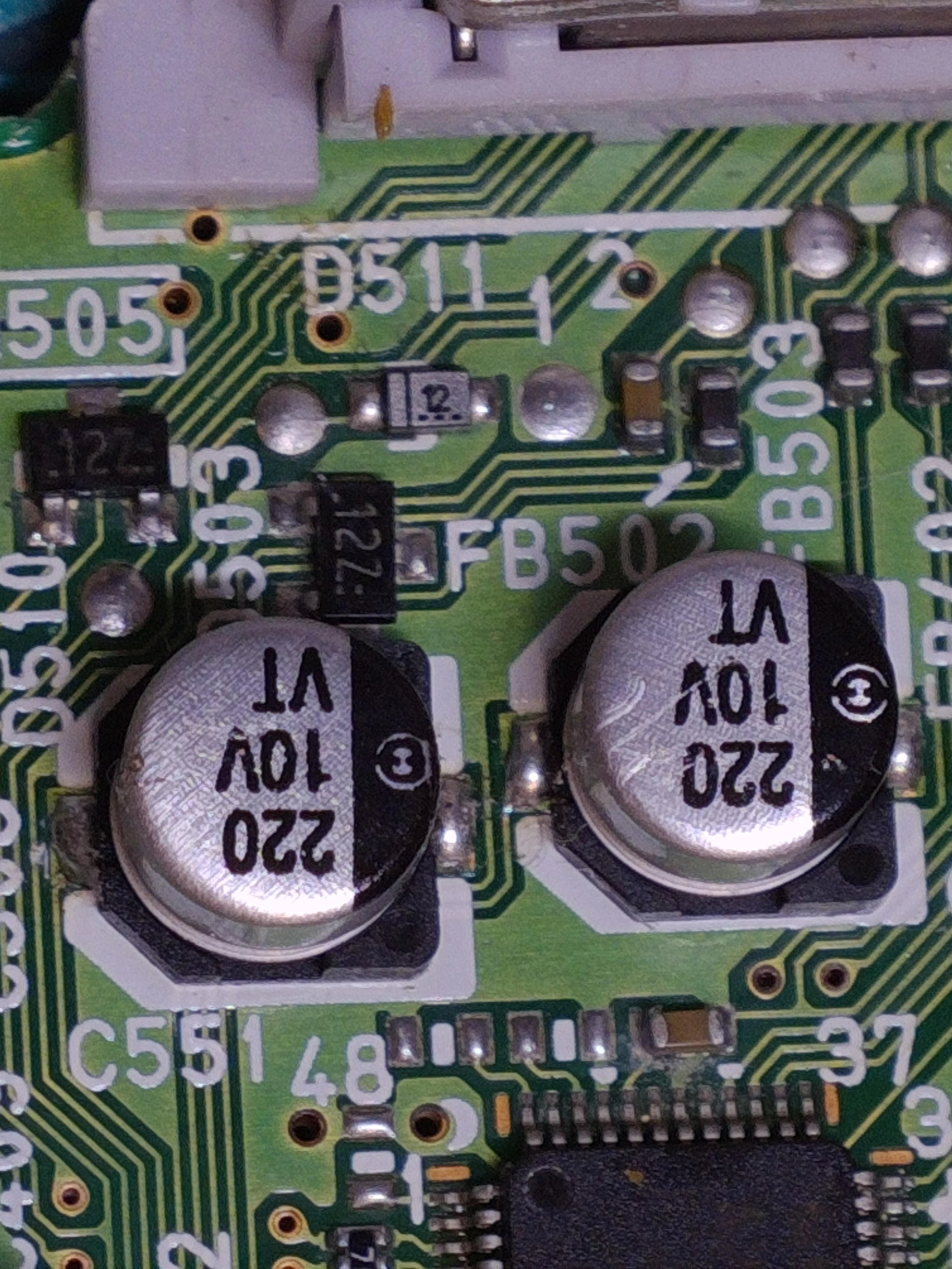 I found 220 µF, 10 V capacitors in my parts bin - lucky to have the exact size needed. I removed the old caps using a soldering iron. Given all the plastic connectors nearby, I decided that the soldering iron was safer than a hot air station.