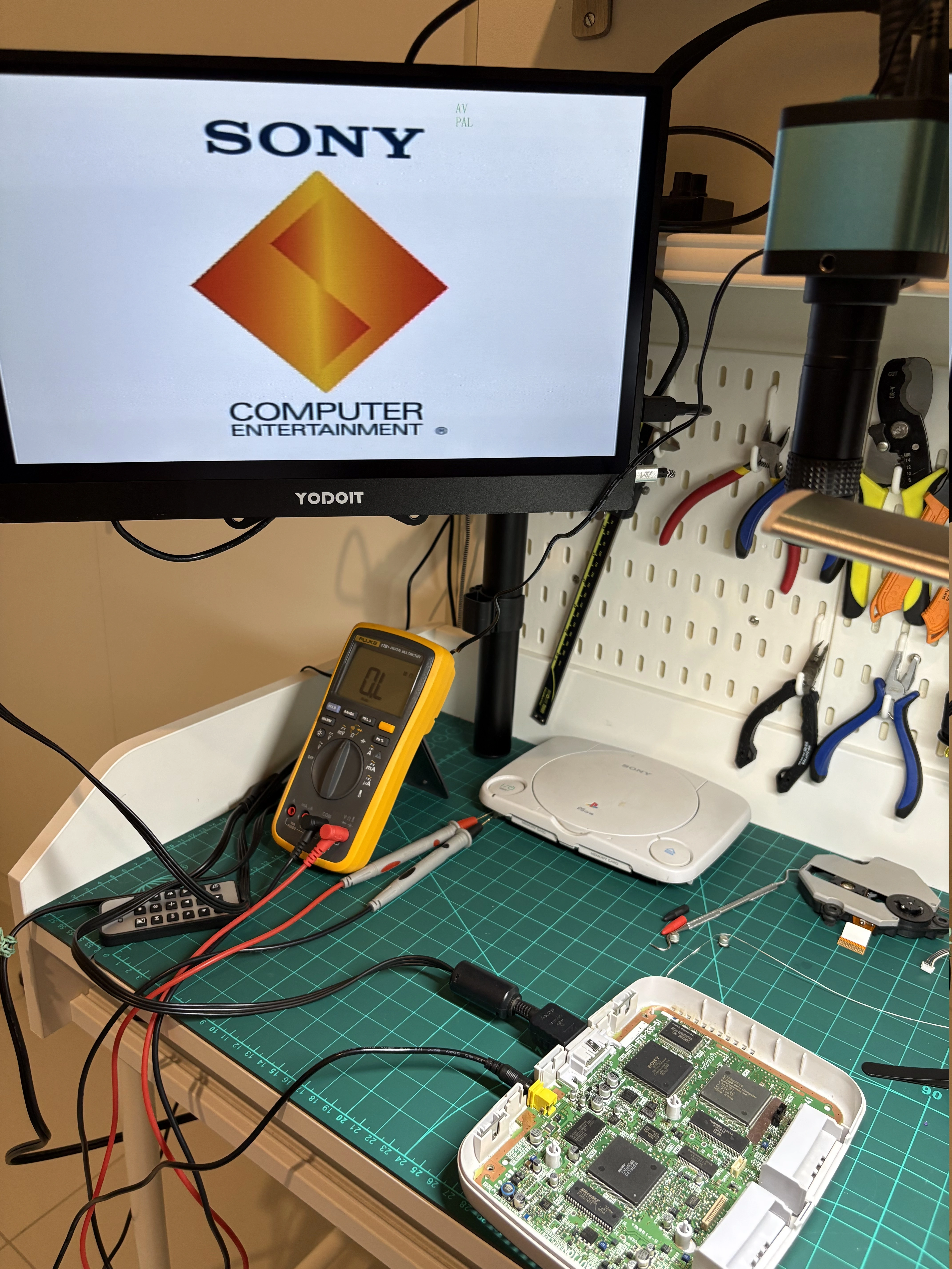 The first thing I noticed after powering up the console and connecting it to a screen was that it didn’t output any picture. I know the console is alive because the LED next to the power button lights up, I can hear the distinct PlayStation boot sound from the speakers, and I can hear the disc drive motors moving. So it’s definitely something wrong with the video output circuit. This is a common issue in PSOnes, and there’s also a well-known way to fix it.