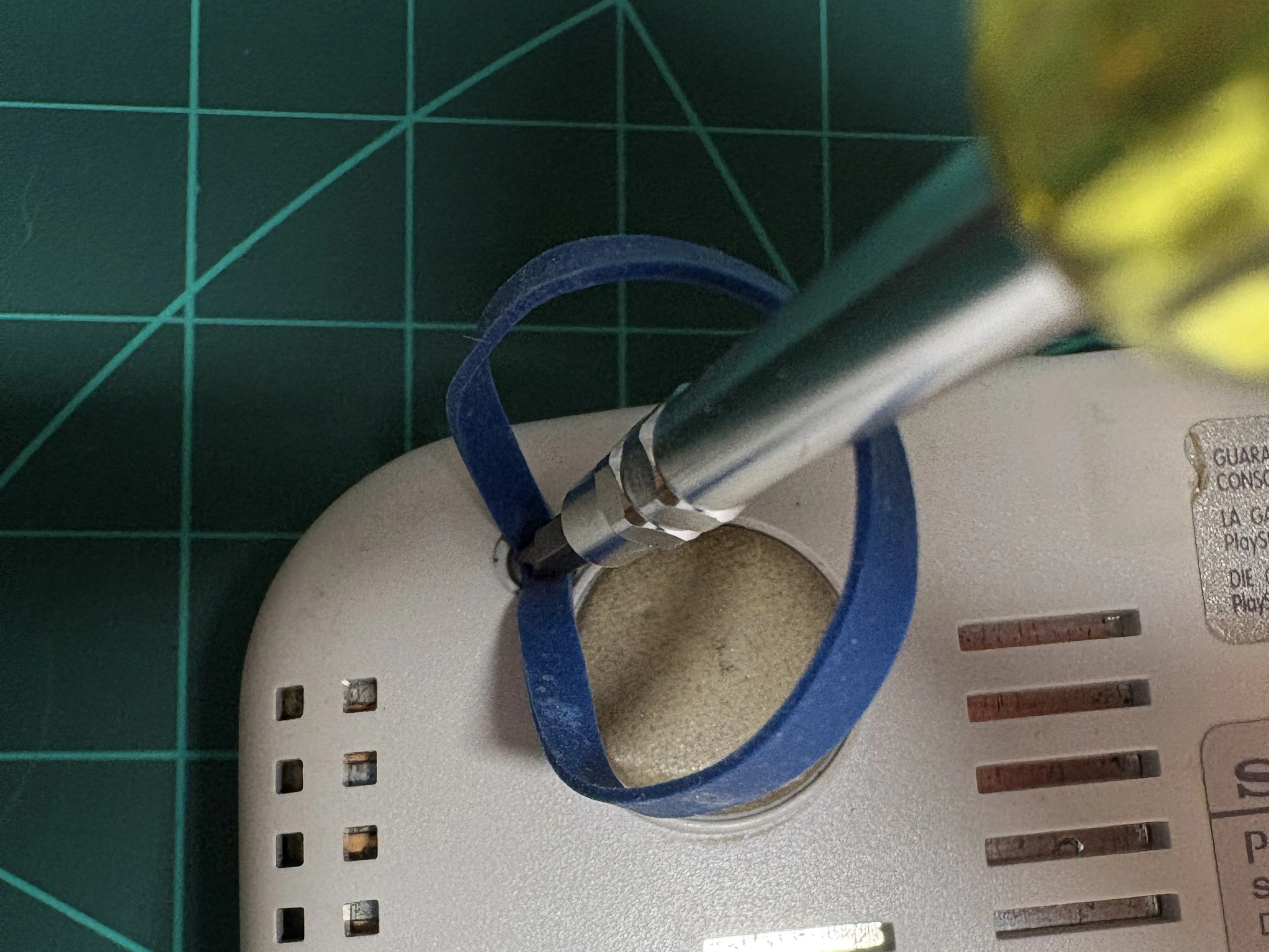 This is the easiest, cleanest, and least invasive of the methods I used. To try it, place a wide rubber band over the screw head, then press the screwdriver into the rubber and turn gently. The rubber helps prevent the driver from slipping. If the screw isn’t completely destroyed, this method can work.